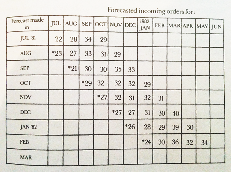 stagger charts: records outlook, how outlook has varied, and actual output. By repeatedly observing the variance of one forecast from another, you improve your ability to forecast–thus improvement or deterioration of the forecast becomes a powerful indicator.